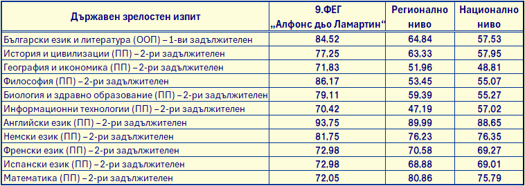 Традиционно отлично е представянето на учениците от Френската гимназия и на 2. ДЗИ по английски език – отличен 5,88, 35 ученици са получили оценка отличен 6,00. Трима наши ученици са с оценка отличен 6,00 на ДЗИ по френски език. Висок среден успех е постигнат и от учениците във випуска по биология и здравно образование и философия, както и индивидуално по всички останали предмети.