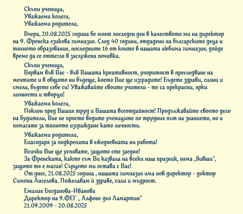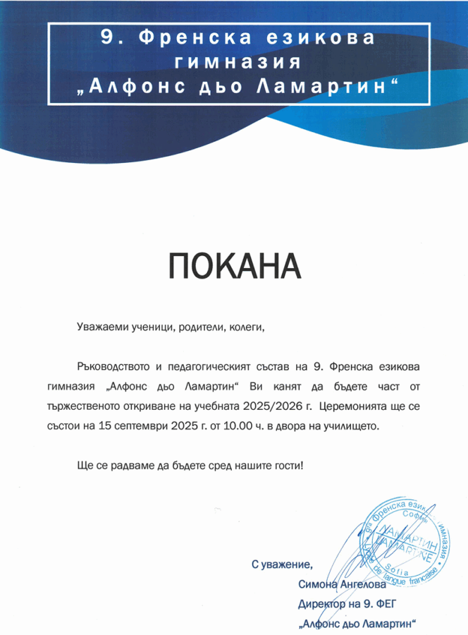 В рамките на честванията на седмото издание на Международния ден на учителя по френски език и като част от фестивалната програма на третото издание на Международния театрален франкофонски фестивал за учители на 28 ноември 2025 г. във Френския институт в България се състоя концерт на хора и музикантите на 9. ФЕГ „Алфонс дьо Ламартин“. Гостите на събитието, сред които бяха г-н Нам – първи секретар в Посолството на Виетнам в България, г-н Люк Леви – директор на Френския институт в България и съветник по образователното сътрудничество към Посолството на Франция, г-н Еманюел Самсон – директор на регионалния център на Международната организация на франкофонията за Централна и Източна Европа, преподаватели по и на френски език от шест страни, учители, ученици и родители, се насладиха на вдъхновяващо музикално пътешествие през франкофонския свят. Под диригентството на г-н Георги Николов – учител по музика в 9. ФЕГ и ръководител на хора на гимназията, бяха изпълнени песни на английски, берберски, български, виетнамски, румънски и френски език. Водещ на вечерта беше г-н Николай Любенов – учител по френски език. Събитието бе организирано по идея на г-жа Вяра Любенова – председател на АПФБ, от Асоциацията на преподавателите по и на френски език в България в партньорство с CREFECO и Френския институт в България, както и с подкрепата на Международната федерация на преподавателите по френски език.