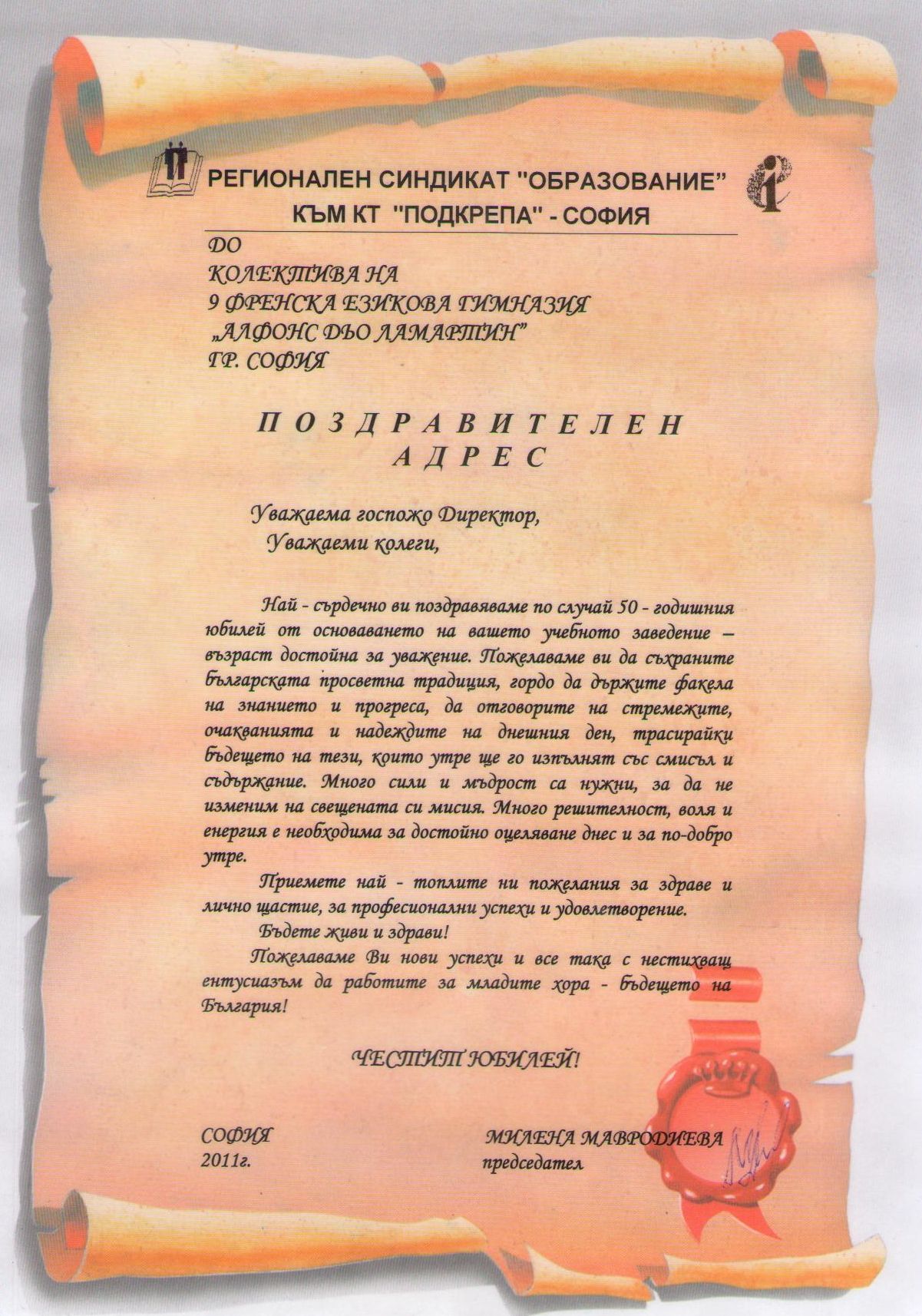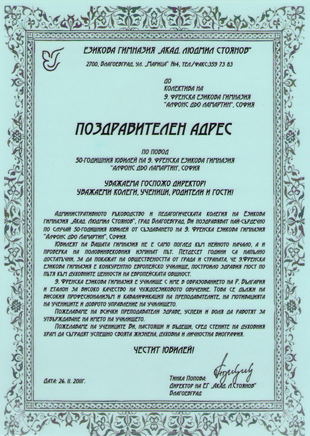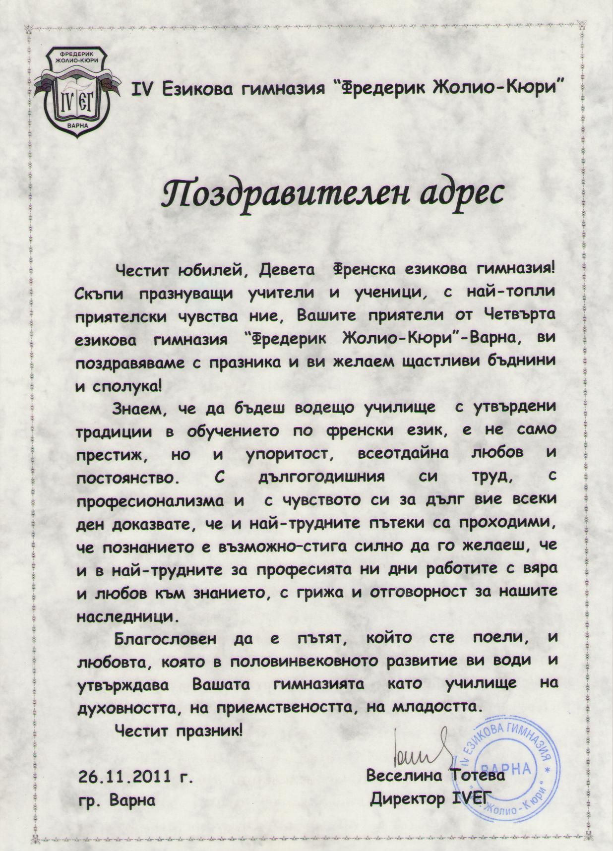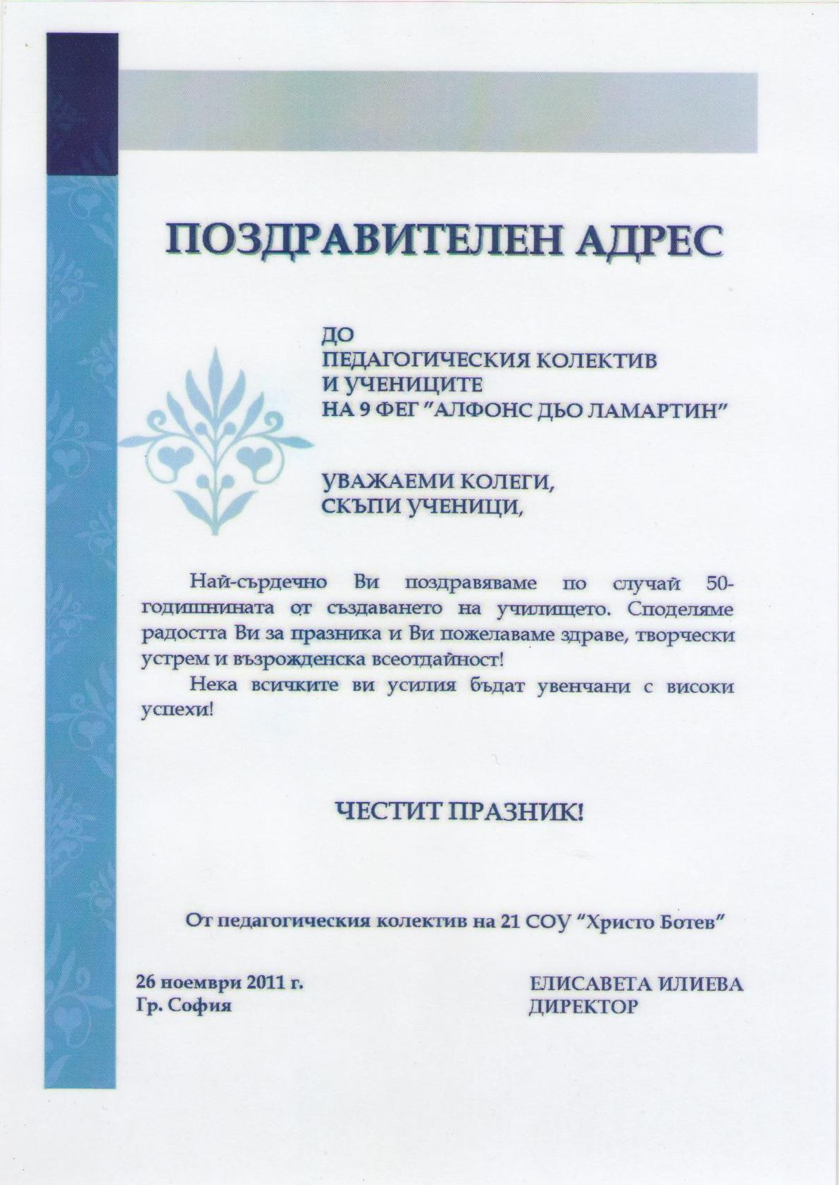 ПОЗДРАВИТЕЛНИ АДРЕСИ ПОСЛУЧАЙ ЮБИЛЕЯ НА 9 ФЕГ