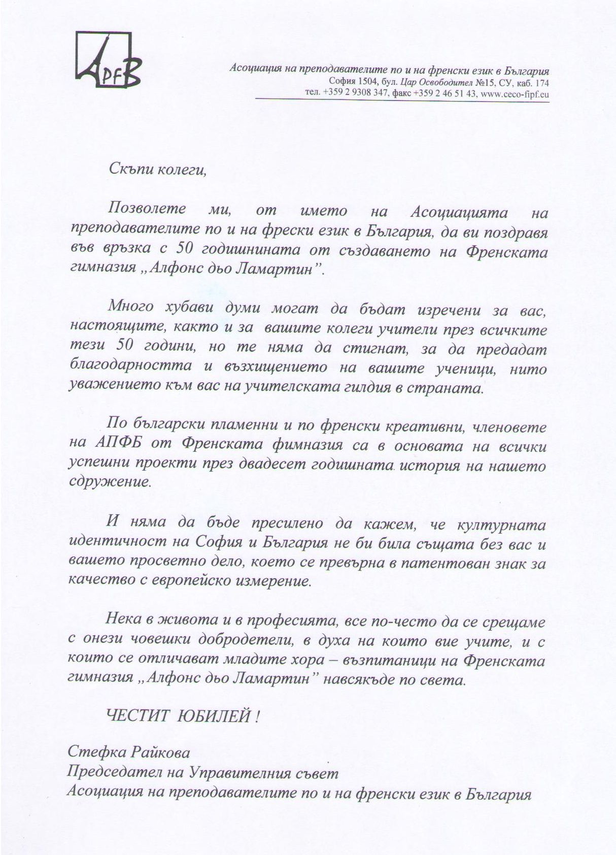 Нека да кажем: „На Френската гимназия – с любов и благодарност“ и ще успяваме, защото сме заедно!