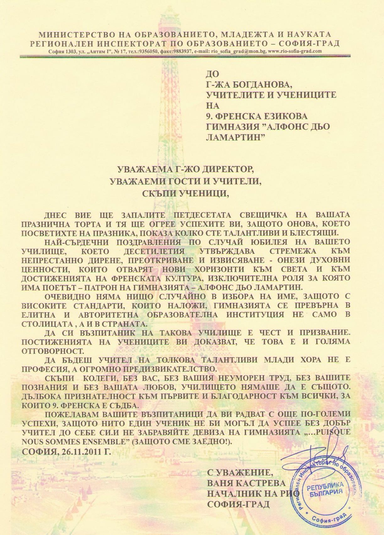 Юбилейният концерт беше кулминация на честванията, започнали през месеца на франкофонията – март 2011 г., като 50 свещички на празничната торта, а поздравителните адреси от възпитаници на 9. ФЕГ от четирите краища на света, от НС, от МС, от МОМН, от РИО на МОМН София-град, от Столична община и от СОС, от учителски синдикати, от десетки училища в София и в страната са доказателство за това, че можем да сме заедно на празника и да се радваме на постиженията.