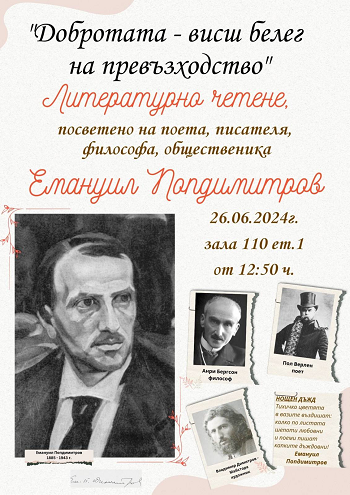 Под този наслов на 26.06.2024 г. се проведе литературно четене с ученици от 10Г клас, посветено на изтъкнатия поет символист и философ Емануил Попдимитров (1885−1943). С това културно събитие се отбеляза краят на една динамична и ползотворна учебна година, а неговото послание остана като спомен за идейните търсения на твореца, но и като собствен ценностен залог.