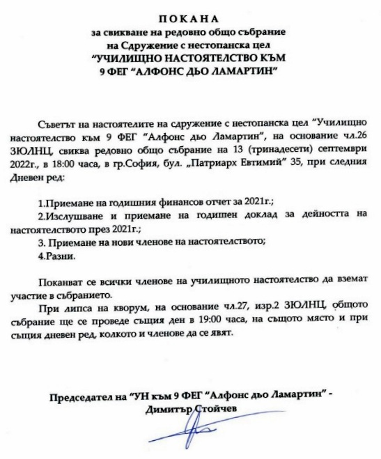 Съветът на настоятелите на сдружение с нестопанска цел „Училищно настоятелство към 9. ФЕГ „Алфонс дьо Ламартин“ свиква редовно общо събрание на 13.09.2022 г. Поканата може да се види тук.