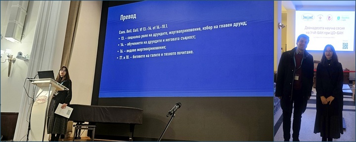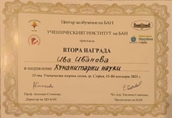 На 15 и 16 ноември се проведе Дванадесетата научна сесия на Ученическия институт на БАН, където Ива Иванова от XII А клас представи своя проект „Античен и съвременен римски прочит на религията в древна Галия въз основа на съчинението на Гай Юлий Цезар „Записки за Галската война“. Представянето ѝ беше отличено с втора награда сред общо 14 проекта, представени в секцията по хуманитарни науки.