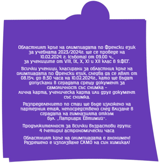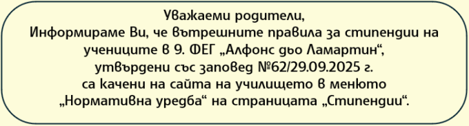 Димитър Димитров, ученик в 12. г клас на 9. ФЕГ “Алфонс дьо Ламартин”, спечели първа награда в конкурса за авторски текстове на латински език Certamen Nubicentauricum, организиран от италианското списание lay0ut magazine. Конкурсът изискваше от участниците да изпратят свой текст – поетичен или в проза – на фантастична тематика в античен или по-съвременен стил. Международното жури, включващо известни преподаватели и изследователи като проф. Ясмин Хаскел (Австралия), доц. Виктория Моул (Великобритания), проф. Милена Минкова (САЩ), Алексис Хелмер (Мексико), Масимо Скорсоне (Италия) и др., определи първа награда в категория до 20 години за разказа на нашия ученик, озаглавен “Leucophron et Pantaglossus”. Повече информация за самия конкурс можете да видите на този линк: https://www.layoutmagazine.it/risultati-certamen-poeticum-nubicentauricum/