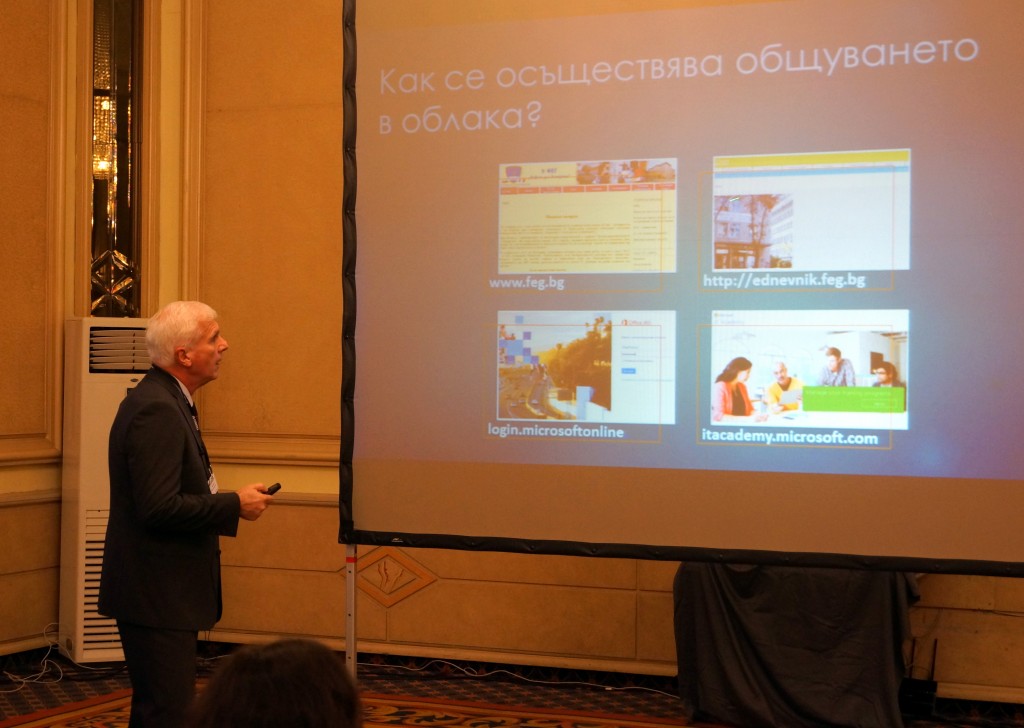 В сесия 2.1.„ИКТ за управление на училищните процеси и технологичните възможности за преподаване на учебния материал“, уводната тема бе „Светът на гимназията в облака на Office365 – неограничени възможности за общуване между учители, ученици и родители“. Тя бе представена от Емилия Богданова-Иванова директор на 9-та ФЕГ и Иван Гьонов – старши учител по информатика и ИТ. В презентацията бяха описани и изобразени резултатите от изграденият и утвърждаващ се гимназиален бранд. Изясни се, че на практика това означава акцентиране на силните страни на Френската гимназия от гледна точка на институциалната ѝ дейност, организацията на работа вътре в нея и възможностите за обучение, които предлага. Бяха очертани атрибутите на бранда – име, домейн, потребителски ИД за Office356 за всеки ученик и учител, онлайн комуникация в облачна среда.