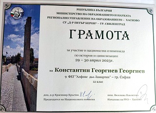 Възпитаникът на 9. ФЕГ Константин Георгиев от 12. д клас се представи блестящо на писмения кръг, на който получи оценка: Отличен (6,00), която повтори и на устното събеседване, по време на което изуми Националната комисия със задълбочените си познания и интереси в областта на съвременната световна история!