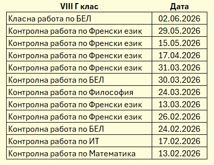 ·         График за класните и контролни работи за VIII Г клас