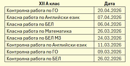 ·         График за класните и контролни работи за XII А клас