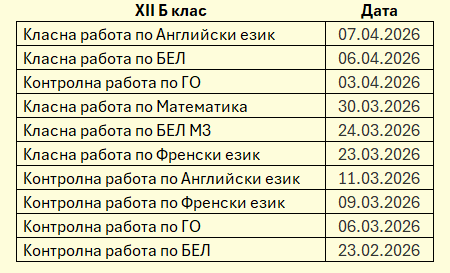·         График за класните и контролни работи за XII Б клас