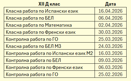 ·         График за класните и контролни работи за XII Д клас