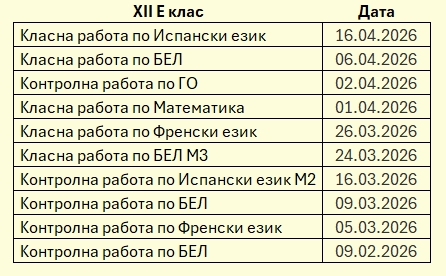 ·         График за класните и контролни работи за XII Е клас