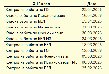 ·         График за класните и контролни работи за XII Г клас