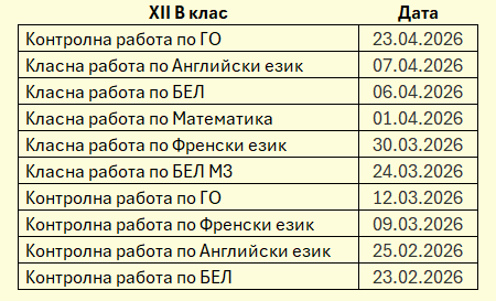 ·         График за класните и контролни работи за XII В клас