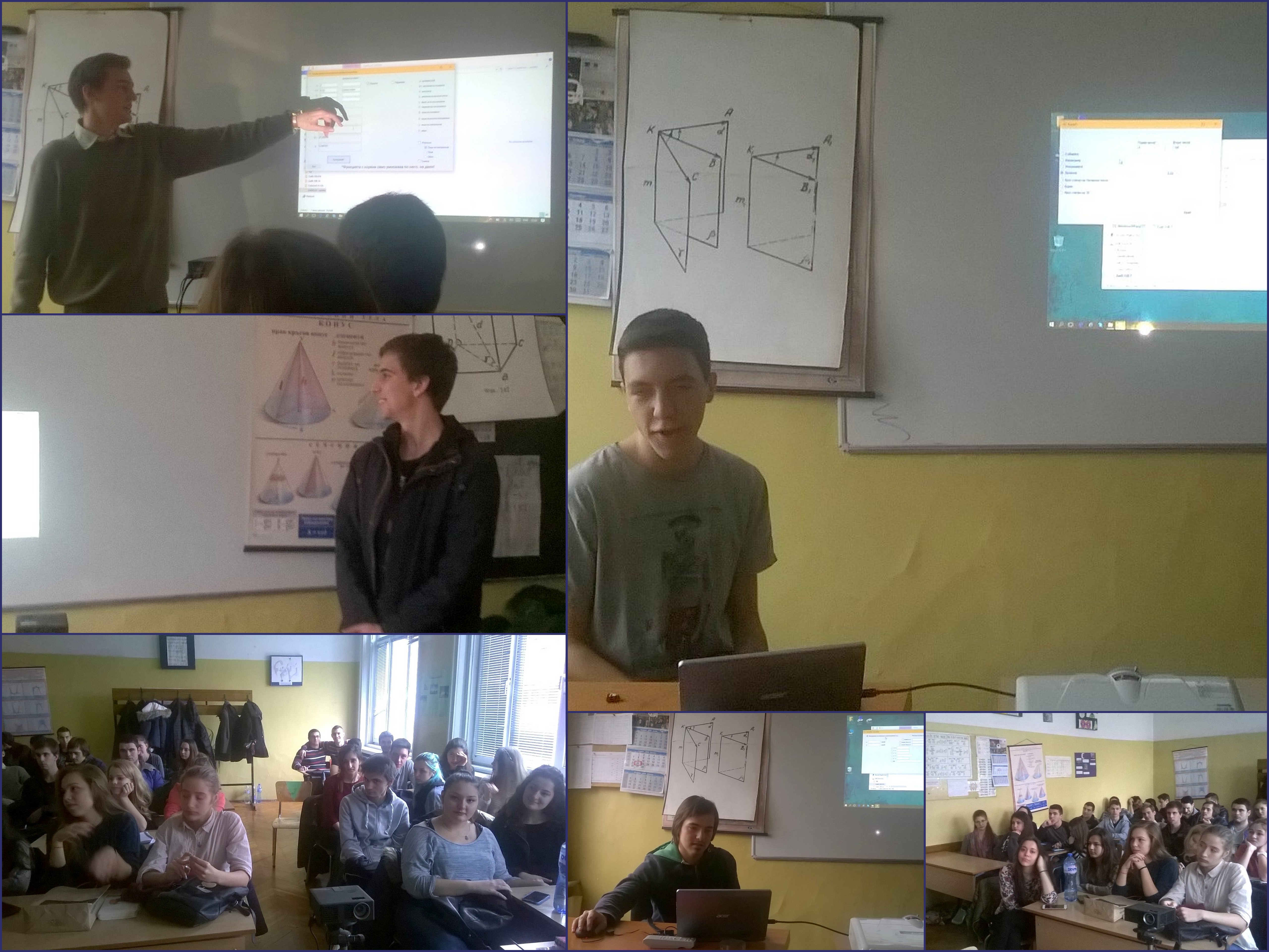 Учениците Боян Бечев, Веселин Дойчинов, Димитър Богданцелиев и Денис Готовански представиха интересни собствени проекти за решаване на математически задачи изготвени с програми от V.S. Те предизвикаха интереса на съучениците си от 12 В клас, като демонстрираха възможности за прилагане на информационните технологии в часове по математика и за по-лесно решаване на задачи от теми, които се изучават понастоящем по стереометрия.