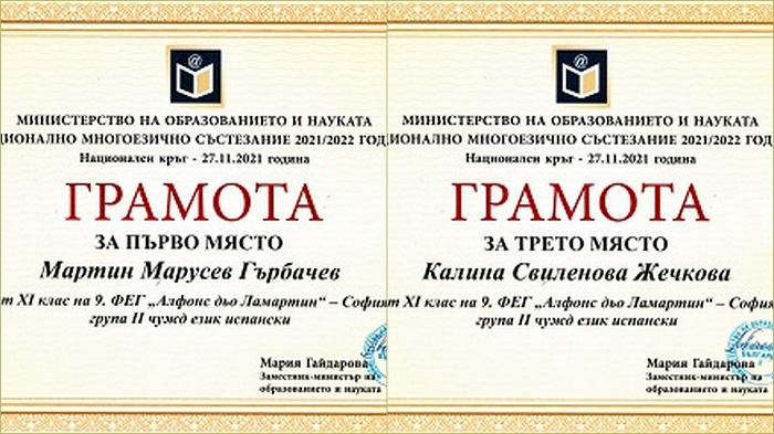 С радост приветстваме нашите лауреати от националния кръг на Многоезичното състезание в категория френски/испански език. Мартин Гърбачев от 11 е клас завоюва първото място, а Калина Жечкова от 11 г клас взе третата награда. Това състезание е истинско предизвикателство за учениците. Участниците в него имаха за задача да преразкажат на втория изучаван език, в случая испански, текст, който са чули два пъти на първия чужд език, т.е. френски. Те трябваше да напишат и аргументативно есе на испански език върху предварително зададен текст за четене с разбиране на френски език.