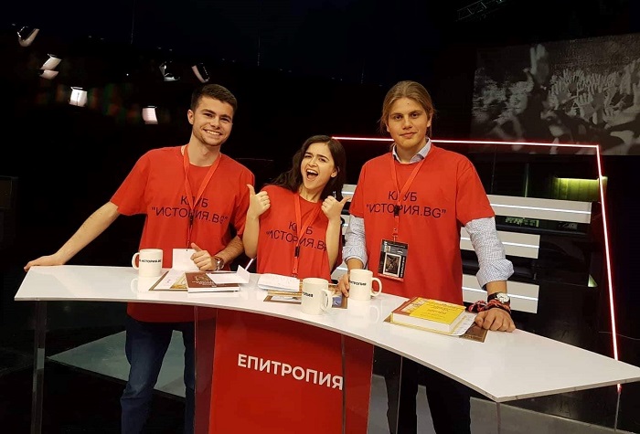 Младите историци на Френската гимназия влязоха в директен сблъсък с представители на Първа английска гимназия в предаването Клуб „История.бг” по БНТ. Отборът ни в състав: Моника Кръстева (12 г), Александър Добрев (12 ж) и Борис Спасов (12 а), впечатли екипа на предаването, публиката и най-вече престижното жури – начело с проф. Пламен Павлов – със задълбочените си познания в областта на българската история и култура. Достойното представяне на нашите възпитаници доказа задълбочената им подготовка, високата им ерудиция, както и аналитичното им мислене и богата обща култура. Поздравления и за техните преподаватели – д-р Силвия Калпакова и г-жа Елза Садулова!
