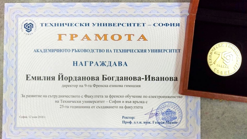 За приноса в развитието на сътрудничеството между Факултета за френско обучение по електроинженерство и Френската езикова гимназия „Алфонс дьо Ламартин“ с юбилеен плакет и грамота бе наградена г-жа Емилия Богданова – директор на гимназията.