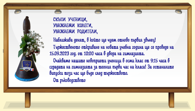 Успешен старт през Новата 2023/2024 учебна Година! Желая Ви мирна,ползотворна и слънчева като днешния 15 септември , учебна година! На добър час!