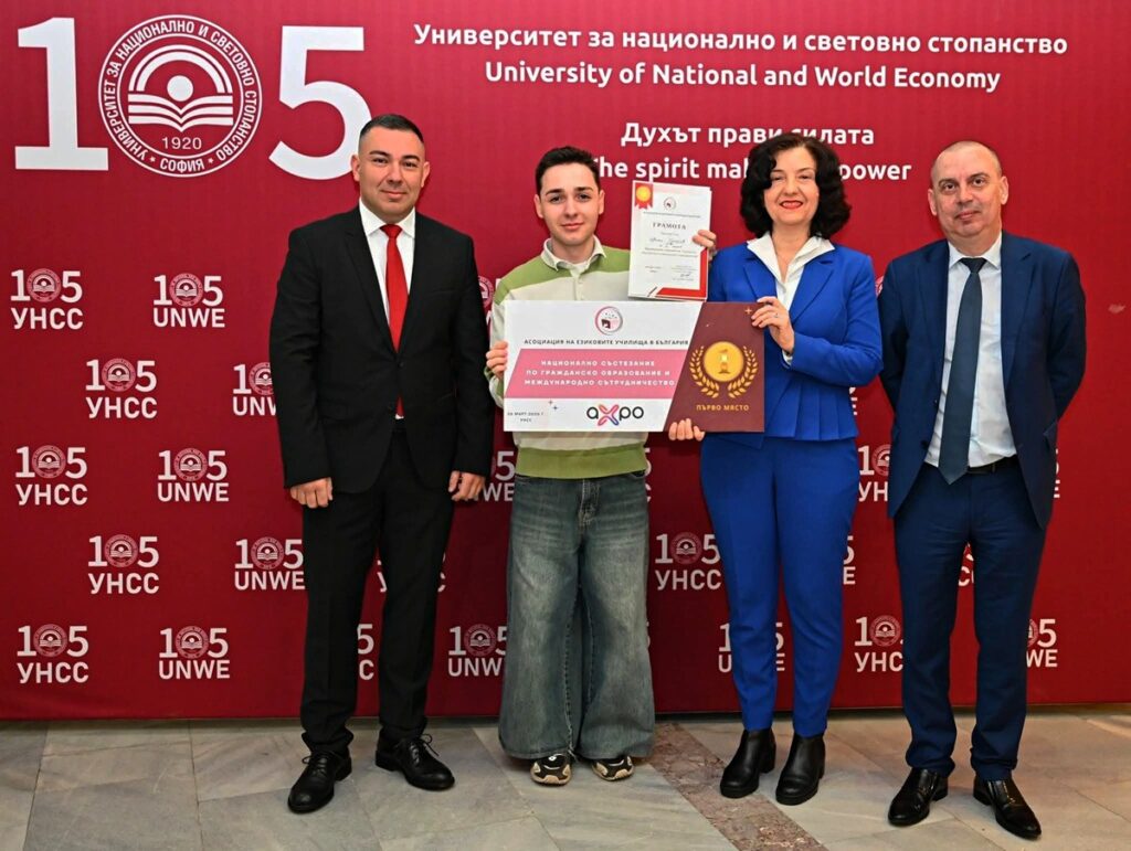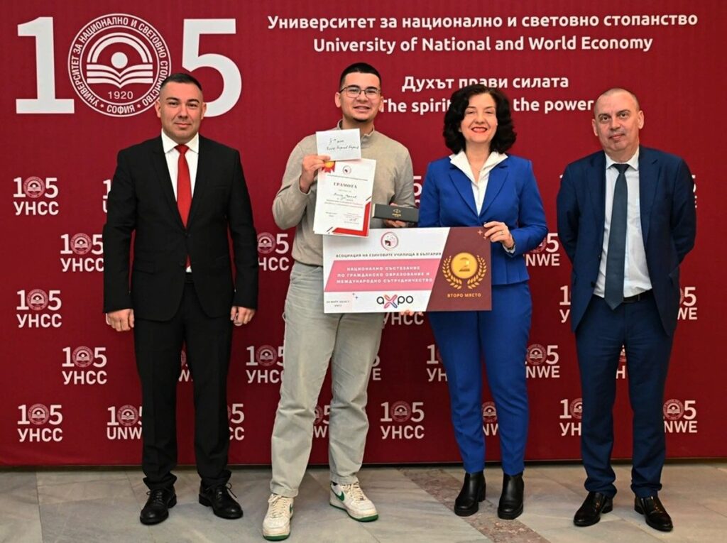 За трети път Асоциацията на езиковите училища в България (АЕУБ) организира Националното състезание по „Гражданско образование и международно сътрудничество“ в УНСС. Тази година в него взеха участие 65 дванадесетокласници от гимназии от различни градове в страната. От 9. ФЕГ „Алфонс дьо Ламартин“ се включиха Виктор Вълчев и Константина Камишева от 12. Д клас, Виктор Георгиев от 12. Е клас и Цветан Стоянов от 12. Ж клас. С най-висок резултат се отличи Цветан Стоянов, а Виктор Георгиев спечели второ място.